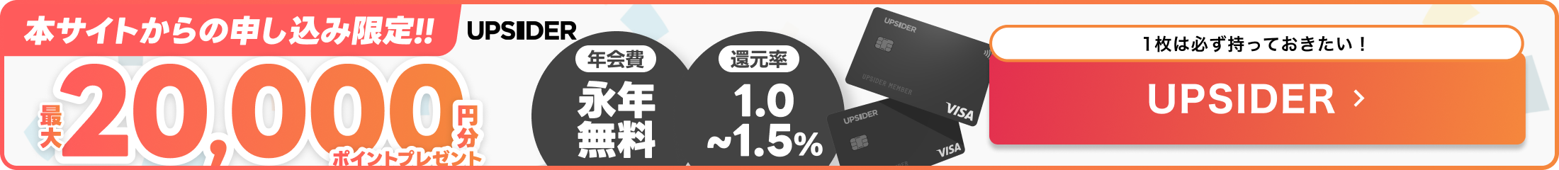 年会費無料でありながらポイント還元率が高い魅力的なUPSIDER法人カードですが、旅行傷害保険などは付帯していないため、出張の多い方はUPSIDER法人カードのデメリットを補完する法人カードとの2枚持ちの検討をおすすめします。